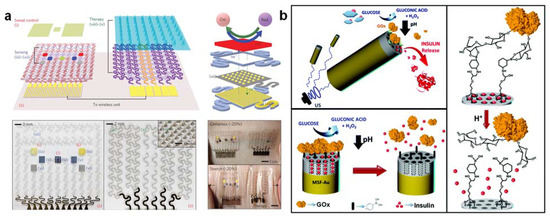 Maintaining a normal glucose level is critical to health management, as high and low glucose levels may indicate a risk of metabolic disorders such as diabetes or hypoglycemic shock, especially after intense exercise or an overdose of glycemic control drugs (e.g., metformin, aspirin, chlorpropamide, Tylenol). The current medical treatment of diabetes patients is focused on the self-monitoring of blood glucose concentration and the subcutaneous self-administration of insulin to maintain normal glycemic levels. This common treatment procedure, however, is intrusive, stressful, and painful, and thus subject to insufficient glycemic control, which can lead to additional complications in health. Significant efforts have been devoted to the design of “closed-loop” therapeutic systems capable of supplying insulin [56] or metformin [57] in response to increased levels of sweat glucose. A fully integrated device for high-fidelity sweat glucose measurement and feedback-controlled insulin or drug delivery enables effective, pain-free management of blood glucose concentration. Ideally, this closed-loop therapeutic unit can inject insulin/metformin at hyperglycemic peaks and glucagon at hypoglycemic pits for effective blood glucose control. The closed-loop therapeutic system could be either a device for transdermal drug delivery (e.g., the temperature-responsive phase change of nanoparticles embedded with microneedles) [57] (Figure 7a) or pH-sensitive nanocarriers [56] (Figure 7b). Since drug delivery through the skin can bypass the digestive system, insulin and metformin transdermal delivery requires a lower dose of drugs than oral delivery and thus prevents gastrointestinal side effects [58]. The integrated wearable tremor sensor detects simulated tremors under low blood glucose conditions that could be induced in hypoglycemic states to inject glucagon. In addition to the temperature-responsive phase-change nanoparticles, particular attention was also paid to glucose-responsive materials based on GOx’s biocatalytic reaction [59,60]. GOx catalyzes glucose conversion into gluconic acid with a decrease in local pH. For the development of stimulus-responsive therapeutic-agent-delivery systems, pH-sensitive nanocarriers based on polymeric nanogels, nanocapsules, and mesoporous silica could be combined with GOx [61]. Nevertheless, the development of wearable bio-responsive nanomachines integrating continuous movement and glucose biosensing with activated insulin/drug release for theranostic precision remains a medical challenge unmet.