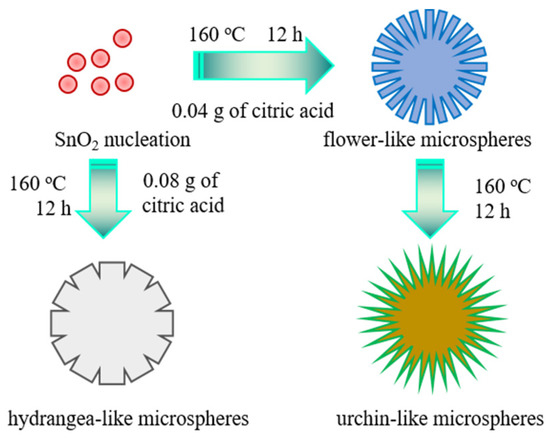 For hierarchical SnO2 architectures, the synthesis process is as follows. It is noted that all the chemical reagents have analytical purity and are used directly. Firstly, a mixed solution was obtained using 20 mL deionized water and 20 mL ethanol by stirring. Then, 0.8 g of NaOH and 0.9 g of SnCl4•5H2O were subsequently dissolved into the above-mentioned mixed solution by magnetic stirring for 30 min. After that, 0.04 g of nitric acid was added into the obtained solution. After stirring for 30 min, the solution was loaded into a 50 mL Teflon-lined stainless-steel autoclave and maintained at 160 °C for 24 h. When the hydrothermal reaction was completed, the autoclave was cooled to room temperature naturally. The precipitates in the autoclave were collected by applying centrifugation and washed using deionized water and ethanol three times to remove impurities and ions on the product’s surface. Finally, washed precipitates were dried at 60 °C for 24 h. As a comparison, another sample was prepared by reducing hydrothermal time to 12 h, and other steps were not altered. The samples after 24 h and 12 h reaction were denoted as SN-1 and SN-2, respectively. In addition, a sample was synthesized by increasing the amount of citric acid to 0.08 g, and other steps were the same as SN-2. The product was recorded as SN-3.