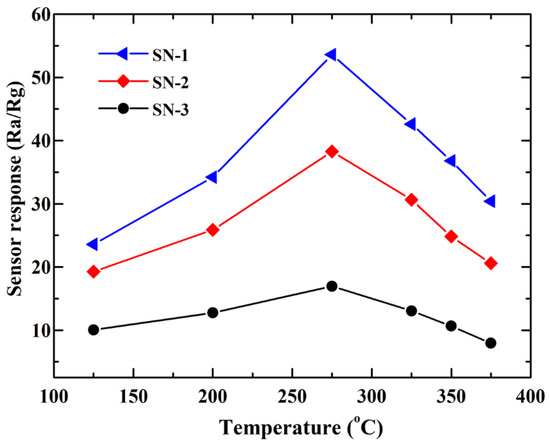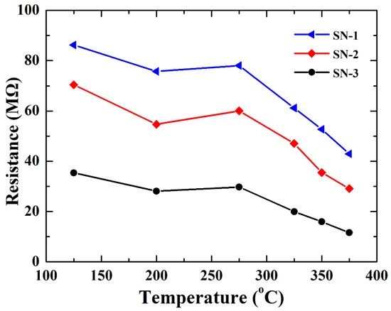 In order to further determine the effect of adsorbed oxygen on gas sensing, the resistance of the three gas sensors in air as a function of temperature was explored. As observed from Figure 9, the resistance gradually reduced from 125 to 375 °C. This result is attributed to two competitive processes. On the one hand, the conductance of three gas sensors increases with the rise of temperature due to intrinsic excitation. On the other hand, adsorbed oxygen traps electrons from the surface of the SnO2-sensing material, deteriorating the transport of electrons. However, when gas sensors are operated from 200 to 275 °C, resistance slightly increases, confirming that the amount of adsorbed oxygen obviously increases. However, when the temperature exceeds 275 °C, the resistance of all three sensors decreased, indicating that the intrinsic excitation is dominant at high working temperatures. This result is also consistent with the optimal working temperature in Figure 4.