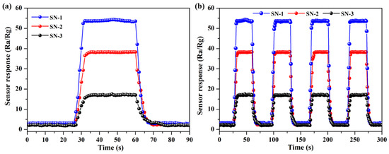Response and recovery behaviors are also vital parameters for gas sensors. Figure 6a shows dynamic response and recovery curves of the three SnO2 samples relative to 50 ppm HCHO at 275 °C. Moreover, basic unit morphology has a significant role on gas-sensing properties. Compared with SN-2 and SN-3, the SN-1 sample-based gas sensor displays higher sensor responses. Moreover, it is evident that sensor responses firstly increase and reach a maximum when the three SnO2-based gas sensors are exposed to 50 ppm HCHO vapor. The response and recovery times of the three sphere-like SnO2-based gas sensors are 5 s, 8 s, and 9 s; and 9 s, 11 s, and 15 s relative to 50 ppm HCHO at 275 °C, respectively. In addition, Figure 6b displays dynamic response and recovery curves for four cycles of three SnO2-based sensor responses. The slight change of sensor responses indicates good repeatability of the gas sensors.