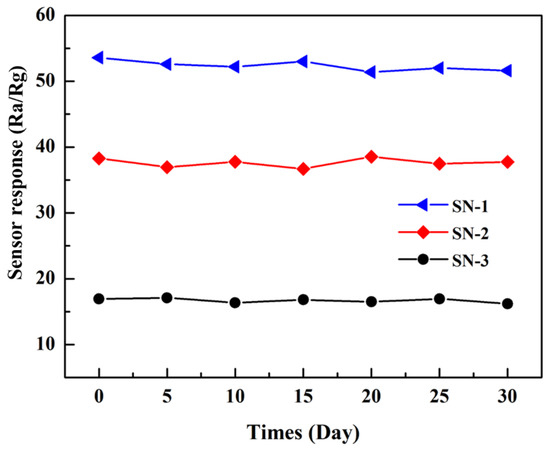 In addition, the long-term stability of the three hierarchical SnO2 microspheres-based gas sensors towards 50 ppm HCHO vapor was tested for a month, and the results are shown in Figure 7. As exhibited in Figure 7, the three SnO2¬-based gas sensors display good long-term stability, and the SN-1-based sensor demonstrates better sensor response than that of SN-2- and SN-3-based gas sensors.