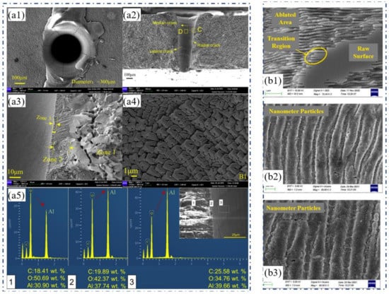 Figure 1a1–a5 show the common morphology of holes in the 1 mm Al2O3 substrate drilled by CPL. Since the target will absorb the laser energy which then goes through the processes of melting, vaporization, sputtering, and removal, this will lead to the formation of the recast layer, cracks, HAZ, and spatter. As shown in Figure 1a1, the hole diameter can be measured to be ~300 µm with a circularity of ~0.96, and there is spatter with a width of ~140 µm in the upper surface of the hole which is due to the cooling of the molten alumina ceramic. Figure 1a2 shows the cross-section of the hole. The taper angle is calculated to be ~3.0°, and three types of cracks are evidenced in the figure. Additionally, a local magnified SEM micrograph of the cross-section of area C in Figure 1a2 is shown in Figure 1a3, where the hole cross-section shows three different layers which are defined as zone 1 (the over-grown zone), zone 2 (the recast layer), and zone 3 (the re-solidified particle layer). Figure 1a4 shows the columnar crystal structure created by the regrowing of the recast layer adhered to the hole wall during the drilling, which has a grain size of approximately 2–3 µm with a square shape. In addition, it can be seen that in Figure 1a5, the atomic ratio of Al–O in the re-solidified particles zone is highest, and the atomic ratio of Al–O in the over-grown grains zone is the lowest. The alumina dissociates after laser drilling and causes massive oxygen vacancies, and the oxygen vacancies will cause alumina discoloration, which gives the recast layer and re-solidified particles a darker color. In addition, during femtosecond laser processing, a phenomenon that is closely related to the laser-induced periodic surface structure (LIPSS) is observed as shown in Figure 1b1–b3 [22].
