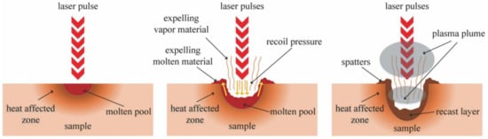 Figure 15. Schematic effect of the laser–matter interaction during (a) long (or short) pulsed laser and (b) ultrafast pulsed laser [60].