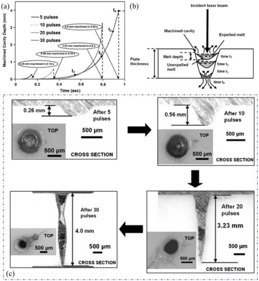 Figure 3. The drilling process of the ceramic: (a) theoretical calculation; (b) schematic diagram of the drilling process; and (c) hole drilled in alumina with different numbers of pulses (5 pulses, 10 pulses, 20 pulses and 30 pulses). Reprinted with permission from ref. [25]. Copyright 2008 Elsevier.