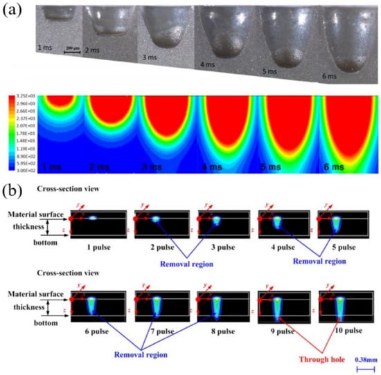 Figure 5. (a) The hole drilled by the experiment and the corresponding simulation results. Reprinted with permission from ref. [31]. Copyright 2012 Elsevier; and (b) the simulation results of the drilling process under different laser pulses. Reprinted with permission from ref. [32]. Copyright 2015 Springer.