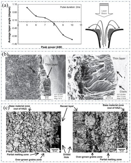 Figure 6. (a) Hole taper angle under the drilling of the laser with different peak power. Reprinted with permission from ref. [33]. Copyright 2009 Elsevier; (b,c) and the cross-section of the hole wall. Reprinted with permission from ref. [34]. Copyright 2013 Elsevier.