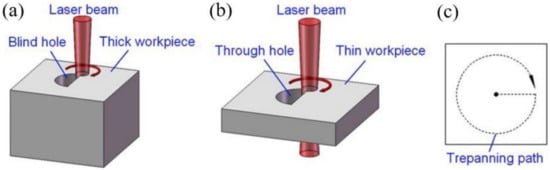 Figure 8. Schematics of the laser trepan drilling of a (a) blind hole; (b) through hole; and (c) the trepan path. Reprinted with permission from ref. [42]. Copyright 2019 Springer.