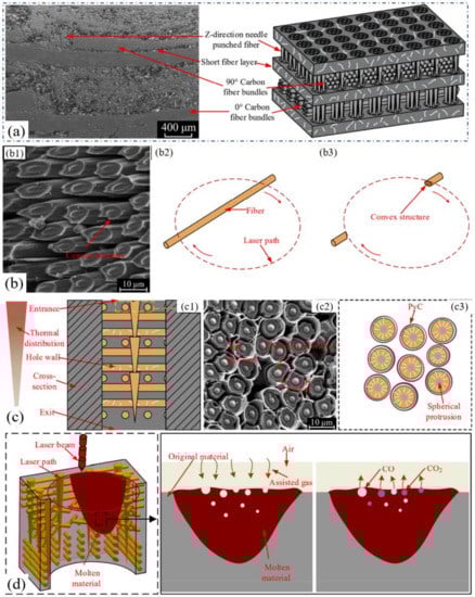Figure 10. (a) Cross-section of the 2.5D Cf/SiC composites; (b) convex structure obtained by the laser ablation of the 0° fiber, (b1) represents the schematic diagram of the fiber before laser drilling, (b2) represents the schematic diagram of the fiber after laser drilling, b3 represents the enlarge of different ablation topographies; (c) spherical protrusion obtained by the laser ablation of the 90° fiber, (c1) represents the selected observation positions on the hole wall, (c2) represents the schematic diagram of the formation of the ablation topography, (c3) represents the observed evolution of the ablation topographies of the fiber during the drilling; and (d) the formation of the bubble particle. Reprinted with permission from ref. [19]. Copyright 2021 Elsevier.