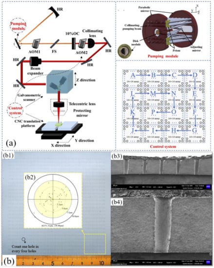 Figure 12. (a) The experimental system, pump module and the control system; (b1) the drilled hole arrays; (b2) the distribution of the position error of holes; (b3,b4) the cross-section of one hole [53].