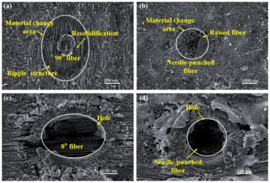 Figure 13. The morphology of the ablation: (a) 90° fiber direction (10 W, 10 s); (b) Z axis needle-punched fiber direction (10 W, 10 s); (c) 0° fiber direction (39 W, 5 s); and (d) Z axis needle-punched fiber direction (39 W, 5 s). Reprinted with permission from ref. [54]. Copyright 2021 Springer.