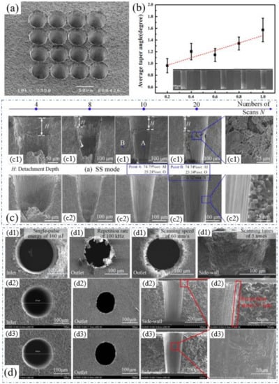 Figure 14. (a) A 40 μm hole array (250 μm thickness, 60 μm pitch). Reprinted with permission from ref. [55]. Copyright 2007 Springer; (b) the relationship between the average taper angles and the scanning pitch. Reprinted with permission from ref. [56]. Copyright 2018 Elsevier. The morphology of the hole wall drilled by (c1) outside/in (c2) inside/out jump direction. Reprinted with permission from ref. [57]. Copyright 2020 Elsevier; the hole drilled by the (d1) non-optimal laser parameters, (d2) optimal laser parameters by filled spiral laser trepan, and (d3) optimal laser machining parameters by multiple rings laser trepan [11].