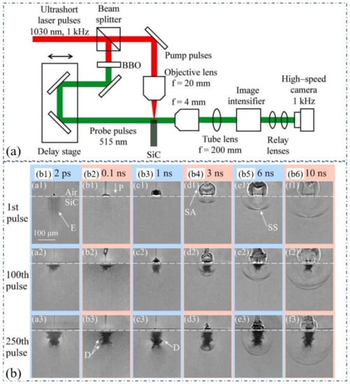 Recently, in order to study the damage process caused by the stress waves in the femtosecond laser drilling process, a pump probe imaging system with high temporal resolution was used by Hattori et al. to study the transient shock wave changes and high-speed dynamic process of crack formation in the process of femtosecond laser drilling. A 1030 nm, 180 fs, 1 kHz, 200 µJ, 5.7 µm laser was used as the pump pulse for the percussion drilling of the SiC with a thickness of 0.35 mm. The probe pulse was a 515 nm femtosecond laser obtained through the 1030 nm femtosecond laser under the frequency doubling of the BaB2O4 (BBO) crystal, which passed through the target from the direction perpendicular to the pump pulse after delaying the process using an optical delay stage. On the other hand, a probe pulse was focused by an objective lens with a focal length of 20 mm. Figure 17b shows the hole shape and femtosecond laser-induced high shock which were observed pulse to pulse. It was apparent that the propagation speed of the pressure waves in the air were much higher than that in SiC as observed at 1 ns after the irradiation of the first ssecond laser pulse, as shown in Figure 17(b1). However, the propagation distances of the pressure waves in the air and SiC in the axial direction became almost equal at 6 ns, whereas at 10 ns, the propagation distance of the pressure wave in SiC exceeded that in the air. In addition, the damage observed after the irradiations of 250 pulses (surrounded by yellow circles) did not exhibit a shape change even after more pulses were irradiated. These characteristics and the fact that the stress waves were generated at the tip of the hole suggest that the propagation of stress waves resulted in fracture; consequently, cracks appeared and were observed as damage [64].