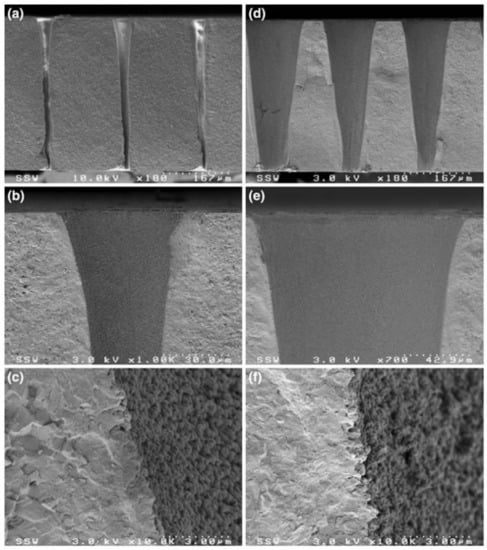 Figure 20. Cross-sections of the hole drilled by (ac) percussion drilling; and (df) trepan drilling. Reprinted with permission from ref. [71]. Copyright 2009 Springer.