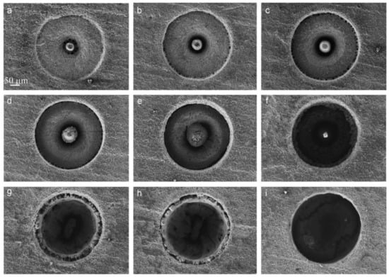 Figure 21. The blind holes drilled by the femtosecond laser with a repetition rate of (ai) 2, 6, 10, 20, 40, 60, 80, 100, and 140 kHz. Reprinted with permission from ref. [73]. Copyright 2015 Elsevier.