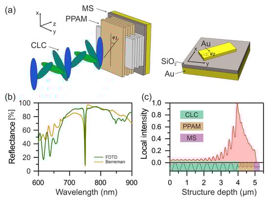 (a) Model of a hybrid structure for obtaining a high-Q COTS consisting of a CLC, PPAM, and MS (left). Schematic of the MS (right). and are the angles between the optical axes at the CLC-PPAM and PPAM-MS interfaces, respectively. (b) Reflectance spectra of the CLC–PPAM–MS structure calculated by the Berreman (orange line) and FDTD (green line) methods. (c) Local field intensity distribution at the COTS wavelength.