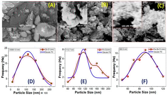 SEM micrographs and the corresponding particle size distribution for (A,D) natural zeolite, (B,E) Fe2O3, and (C,F) Fe2O3-zeolite.