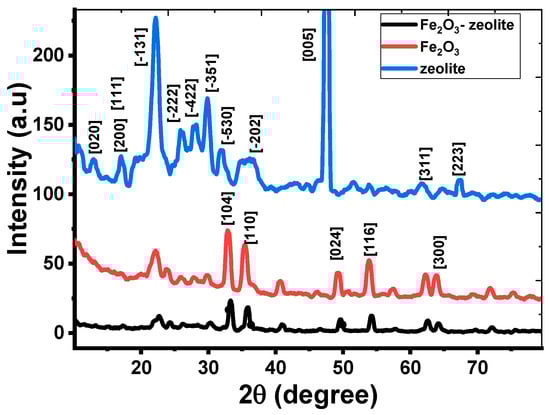 The phase and crystallinity of the zeolite, Fe2O3, and Fe2O3-zeolite photocatalysts were studied by using XRD analysis as displayed in Figure 2.