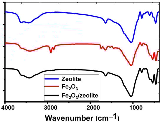 FTIR spectra of zeolite, Fe2O3, and Fe2O3-zeolite photocatalyst.