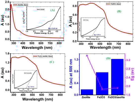 Figure 4 shows the absorption spectra of zeolite, Fe2O3, and Fe2O3-zeolite. The zeolite powder presents a prominent peak due to a substantial photoabsorption band in the ultraviolet (UV) region, as seen in Figure 4A. As the wavelength becomes longer, the absorption drops rapidly. This indicates that the zeolite sample’s spectral response in the visible light region was exceedingly low. Figure 4B,C shows that the optical absorbance of Fe2O3 was modified after loading Fe2O3 onto zeolite. The Fe2O3 has strong absorption in the visible and UV regions [29]. Due to the spin-forbidden-excitations and straight transition, Fe2O3 has a broad absorption band in the visible region [30,31,32]. A wide and sharp absorption band in the visible region was detected for the Fe2O3-zeolite as seen in Figure 4C. The absorbance values of zeolite, Fe2O3, and Fe2O3-zeolite photocatalysts are 0.18, 0.76 and 1.22 at λ = 500 nm, respectively, Figure 4D. This means more and more photons in the visible region can be absorbed by Fe2O3-zeolite than Fe2O3. This would be preferable to generate a large number of electron-hole pairs by transferring electrons from the valence to conduction bands. As result, zeolite has significantly improved the visible light absorption capability of the loaded Fe2O3 photocatalyst.
