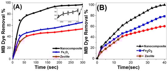 The photocatalytic degradation of 100 mL MB dye solution of concentration 10 mg/L at pH 7 using zeolite, Fe2O3, and Fe2O3-zeolite photocatalyst (A) 20 mg, and (B) 60 mg. The inset shows the statistical error bars.