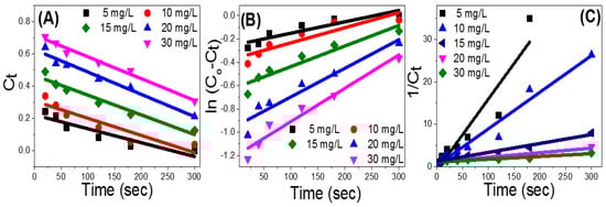 Facilitating the wide-ranging application of the photocatalyst requires understanding and exploring the photocatalytic reaction kinetics. The MB concentration-time curves were used to identify the suitable catalytic photodegradation kinetics for MB. In the heterogeneous photocatalytic process, the photocatalyst cleaves the aromatic ring of the dye molecules and initiates its degradation. The kinetic modeling explains the nature of the photocatalytic mechanism. The kinetic models’ parameters, containing the photocatalytic degradation rates, have been calculated by presented Ct, ln(C0/Ct), and 1/Ct vs. exposure time (t) for zero-order, pseudo-first-order, and pseudo-second-order, correspondingly. In that order, the kinetic models are presented in Equations (1)–(3) [44].