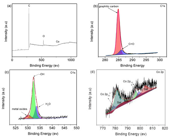 The composition and chemical states of the microcapsules are presented in the XPS spectra (Figure 4). The peak at 285 eV is from C1s, and the ones at 530 and 790 eV are ascribed to the O1s and Co2p, respectively, as shown in Figure 4a. The C 1s spectrum (Figure 4b) shows two peaks, where the one at 284.6 eV is indexed to graphite carbon. Moreover, peak at 285.9 eV represents C=O [17]. O 1s spectrum (Figure 4c) exhibits three peaks at 530 eV, 532.2, and 533.5 eV, corresponding to lattice oxygen, ‒OH and H2O molecules, respectively [25,26,27]. The Co 2P spectrum (Figure 4d) shows 781.0 and 799 eV of Co2+ [28], and 778.7 and 796.6 eV peaks are from Co3+ [29,30].