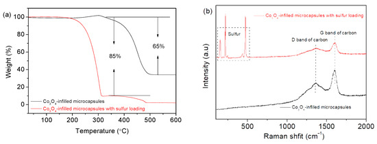 (a) TGA profiles and (b) Raman spectra of Co3O4-infilled microcapsules with and without loading sulfur.