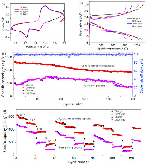 Figure 7a displays the CV curves. During the discharge, two reduction peaks at 2.25 and 1.95 V are attributed to the conversion of high-order polysulfide to Li2S4 and reduction of Li2S4 to Li2S2/Li2S [34,35]. In the charging process, the oxidation at 2.4 V is ascribed to the conversion of Li2S2/Li2S to Li2Sn [36]. In Figure 7b, two discharge plateaus at 2.2 and 1.9 V are verified. The platform at 2.4 V in charge corresponds to oxidation peak [37]. It is noted that the overpotentials are observed, which may be attributed to the non-completed carbonization and the resulting limited conductivity. Figure 7c shows that the specific capacity remains 935 mAh g−1 after cycling 200 times at 0.5C (1C equates to fully charging or discharging the theoretical capacity in 1 h). The Coulombic efficiency is close to 100%. Compared to the performance of the Co3O4/S-infilled microcapsules, the capacity of pure sulfur powders is very low. In particular, the capacity decays rapidly after 150 cycles. In addition, the electrochemical performance of the microcapsules is also competitive compared to some other composites, as displayed in Table 1. Figure 7d shows the rate performance after repeated tests. In the second round, specific capacities are 1250, 1150, 860, and 500 mAh g−1 at rates of 0.1C, 0.2C, 0.5C, and 1C, respectively. It recovers to 1190 mAh g−1 once the rate is returned to 0.1C. Microcapsules exhibit a better reversibility and higher capacities than sulfur powders. It is attributed to the improved conductivity by the carbon shell and the reduced polysulfide loss by Co3O4 adsorption, which will be demonstrated by DFT calculations.