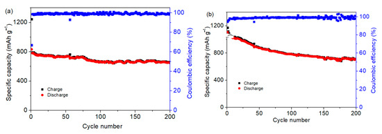Specific capacities of Co3O4/S-infilled microcapsules when cycling at different temperatures of (a) −10 °C and (b) 50 °C at 0.5C.