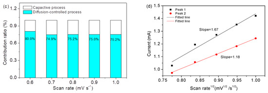 Figure 9a displays CV curves of Co3O4/S-infilled microcapsules at 0.6 to 1 mV s−1; Figure 9b displays a logarithmic relationship according to i = avb, where i and v stand for the peak current and rate, respectively [49]. The b value of 0.5 represents a diffusive-controlled process, and b = 1 indicates a capacitive behavior. In this investigation, b values suggest mainly diffusion-controlled processes. Figure 9c shows the diffusion contribution ratios calculated on the basis of i(v) = k1v + k2v1/2, where k1v and k2v1/2 stand for capacitive and diffusion-controlled contributions, respectively. The results were fitted (Figure 9d) based on IP = 2.69 × 105 × n3/2AD1/2Cv1/2 [50], where Ip is the peak current; n is the number of electrons transferred during the reaction, which is 2 for Li-S batteries; A is the active electrode area (1.13 cm2); D is the diffusion coefficient of lithium ion in unit of cm2 s−1; C is the concentration of Li ions in electrolyte in unit of mol mL−1 [51,52]; and n is the scanning rate in the unit of V s−1. On the basis of the obtained slopes, the Li ion diffusion coefficients are calculated to be 3.8 × 10−9 and 1.8 × 10−9 cm2 s−1, which are close to some reports [53,54]. The good diffusion property is ascribed to the specific microcapsule structure, which enables a good environment for contact with electrolytes; the porous scaffold of Co3O4 nanocages assembled by nanoparticles shortens the transfer pathway of ions.