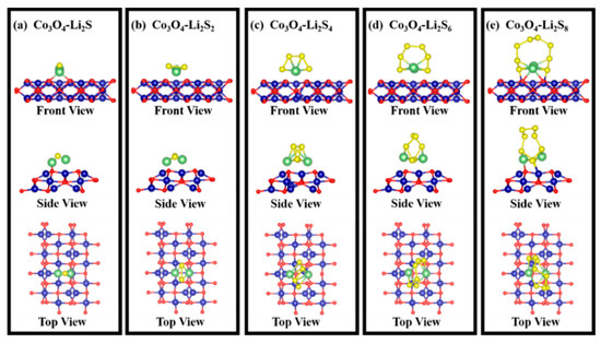 Adsorption models between polysulfides and Co3O4 (110) surface: (a) Co3O4-Li2S; (b) Co3O4-Li2S2; (c) Co3O4-Li2S4; (d) Co3O4-Li2S6; (e) Co3O4-Li2S8.