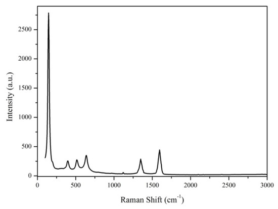 The Raman spectrum of MWCNT_TiO2 presented in Figure 2, confirms the specific band of anatase TiO2, such as 148.22 cm–1, 398.92 cm–1, 518.15 cm–1 and 639.31 cm–1. Moreover, the specific bands of MWCNTs are present, at 1597.63 cm–1 (G band), which refers to the crystalline nature of the MWCNTs and the band at 1346.29 cm–1 (D band), which indicates the distortions on the MWCNTs surface. The presence of D and G bands confirms the interfacial interaction between MWCNTs and TiO2 nanoparticles [33]. The ID/IG band ratio was calculated to be 0.842. Compared with the ID/IG band ratio of pure MWCNTs (0.839) [18], it can be suggested that the increasing of the ID/IG band ratio occurs because of the structural defects in the carbon wall, confirming thus, the modification of the outer layers of the MWCNTs by nanoparticles deposition.