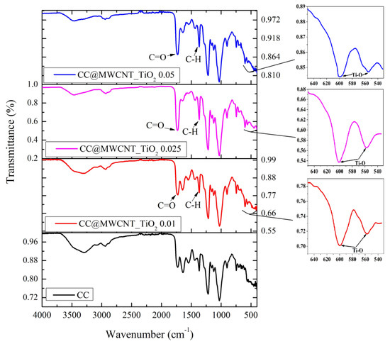 By adding MWCNTs_TiO2, new characteristic peaks are observed, especially when the nanocomposite concentration increased. The FTIR spectra shows sharper peaks at 1371 cm−1 that are related to the C–H bonds characteristic of carbon nanotubes’ skeleton and 1730 cm−1 related to C=O from MWCNTs oxidation (indicating that carboxylic groups are formed due to the oxidation of some carbon atoms on the surface of the MWCNTs) [18,38]. The presence of TiO2 nanoparticles was confirmed by the band at low wavenumber around 605 and 558 cm−1.