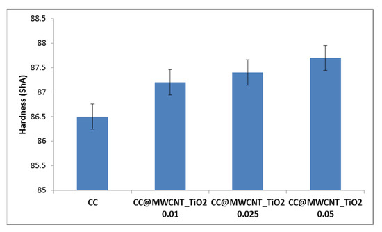 Maintaining a good mechanical character of the material is a very important feature of dressing. It has been reported in several studies that the incorporation of NPs into polymer composites significantly changes their mechanical properties [39]. Thus, the hardness of the obtained films was measured. As can be observed in Figure 8, the behaviour suggests that the bonding and microstructure of the films change significantly with increasing the MWCNTs_TiO2 content. It can be observed that even when a low content of MWCNTs_TiO2 was incorporated into the CC solution, effective hardness was obtained, compared to CC film. The large surface area of the nanomaterials leads to a stronger interfacial interaction between them and polymer molecules, and stress is better transferred through the materials which are subjected to mechanical effort, resulting in better properties of the CC films. Therefore, incorporating MWCNTs_TiO2 as reinforcing elements into the film could result in additional strength to the composite biomaterials.