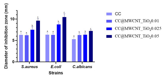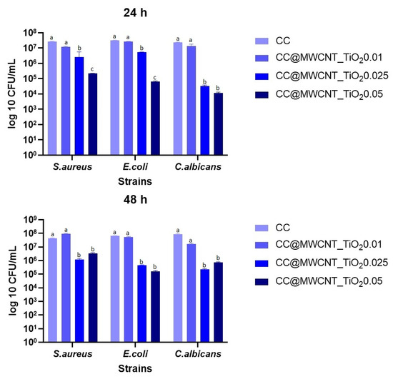 The obtained results sustain that the biofilm expansion was significantly reduced at 24 h in all the cases of tested strains, when the films with the highest concentrations of nanocomposites were used (CC@MWCNTs_TiO2 0.025 and CC@MWCNTs_TiO2 0.05), so we can suggest that biofilm inhibition is dependent on the nanocomposites concentration (Figure 10). This tendency is maintained after 48 h, which suggests that the films are capable to offer protection over time. These results demonstrate that the presence of the hybrid nanomaterials is an important point. Many studies demonstrated the antimicrobial character of TiO2 NPs [41,42] and MWCNTs [18,43]. These data suggest that the films can combat specific pathogens, especially in wound-healing application, due to their higher effectiveness against Gram-positive and Gram-negative bacteria and yeast.