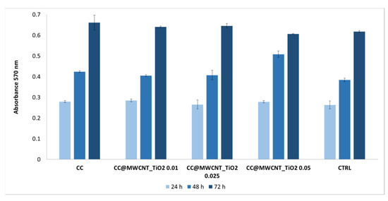 MTT assay presented in Figure 12 shows that the obtained films present absorbance values close to the control sample at 24 h to 72 h, proving their non-toxicological effect. The metabolic activity of HDFn in the presence of films demonstrates to be higher than in the control cells, suggesting that cells are viable, improving thus the proliferation capacity. At 72 h, an increased proliferation capacity was observed for the films containing low and moderate quantity of nanocomposites (0.01 and 0.025 g MWCNTs_TiO2), compared to the control. These results sustain that the nanocomposites dose is one of the main factors in the relationships between the responding cell type and nanomaterials. An ideal biomaterial-based nanoparticles has to present the ability to minimise cytotoxicity to a range of potentially exposed cells. Regarding this, there are several reports that sustain that TiO2 nanoparticles and MWCNTs are non-toxic, and their exposure does not lead to membrane damage or cell death [44,45,46].