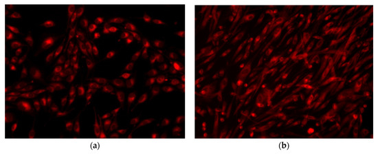 In order to evaluate the biocompatibility of the obtained films a RED CMTPX fluorophore (Thermo Fischer Scientific, Waltham, MA, USA) was used. The CMTPX was added to the HDFn cell culture, in the presence of the obtained films. After 5 days, the viability and morphology of the HDFn were evaluated. The CMTPX fluorophore, at a concentration of 5 µM and incubated for 30 min, was added in the culture medium with the purpose to permit the dye penetration into the cells. Lastly, the HDFn cells were washed with PBS. An Olympus CKX 41 digital camera driven by CellSense Entry software (Olympus, Tokyo, Japan) was used to visualise the cells.