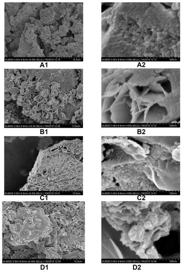 SEM micrographs of S1 (type F12, from frozen biomass, cultivated 1 week, ×4·10−3 (A1) and ×100·10−3 (A2) magnifications), S2 (type F12, from fresh biomass, cultivated 1 week, ×10·10−3 (B1) and 100·10−3 (B2) magnifications), S3 (type F34, from frozen biomass, cultivated 3 weeks, ×10·10−3 (C1) and ×100·10−3 (C2) magnifications), S4 (type F34, fresh biomass, cultivated 5 weeks, ×5·10−3 (D1) and ×100·10−3 (D2) magnifications) ferrihydrite particles.