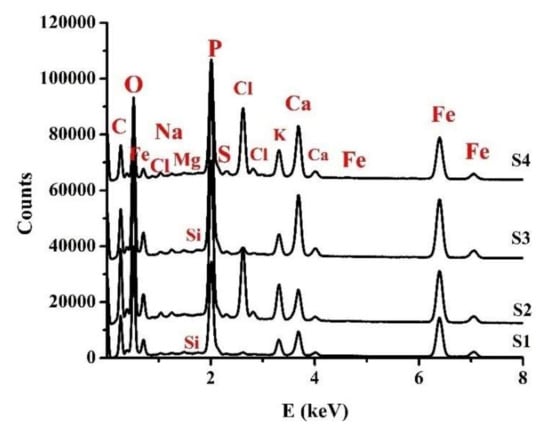In Table 2, the elemental contents depicted are as follows (concentration levels in descending order, c%): (i) O, Fe, C, P (c > 10%); (ii) Ca, K, N (S2 and S3), Cl (S2 and S4) (10% > c > 1%); (iii) Na, Mg, Si (S1 and S3), S (S2, S3 and S4), and Cl (S1, S3 and S4).