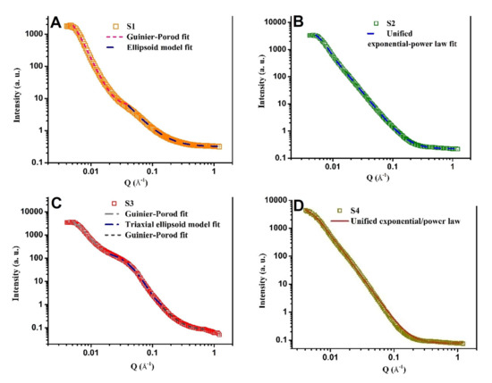 In Figure 3A–D the small-angle X-ray scattering experimental curves and their fits are presented. It can be seen that the SAXS structural features for all samples were different.