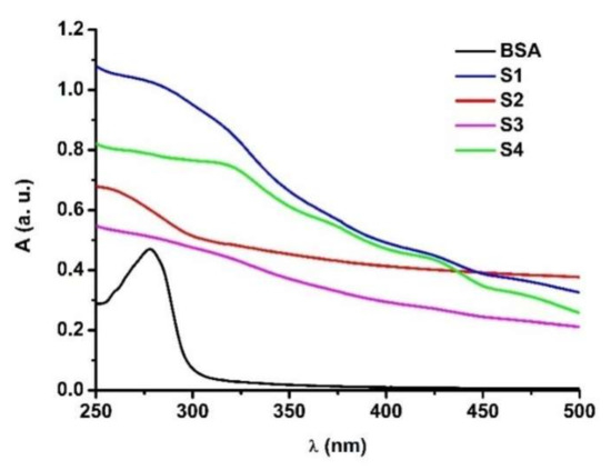 The absorbance of BSA (3 µM) and of S1–S4 (3 µM) samples at pH 7.45. Samples were studied in 100 mM HEPES buffer, at room temperature.