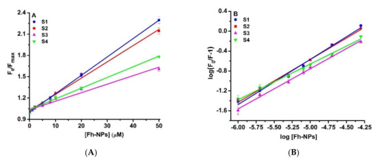 A fluorimetric approach was used to investigate the mechanism of the binding between biogenic ferrihydrite nanoparticles from the S1–S4 samples and BSA at room temperature. For this purpose, the Stern–Volmer Equation (11) was used: