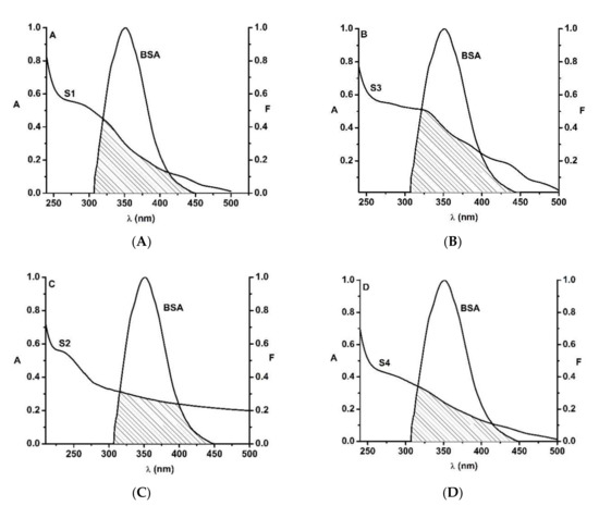 The overlap of the fluorescence emission spectrum of BSA and the absorption spectrum of biogenic ferrihydrite nanoparticles ([BSA]:[ferrihydrite nanoparticles] = 1:1) for the samples S1 (A), S2 (B), S3 (C) and S4 (D).