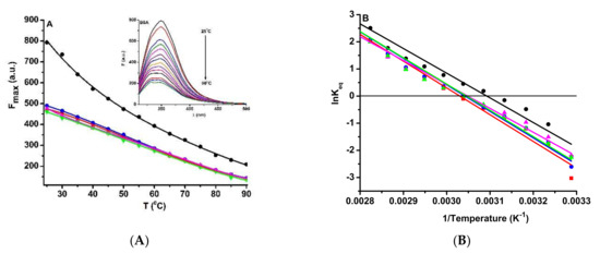 In the case of thermal denaturation, a decrease in fluorescent emission of BSA and BSA-biogenic ferrihydrite nanoparticles was observed with increasing temperature (Figure 7A). This is an indication of the unfolding of BSA conformation. For a more complex study of the denaturation temperature, Van ’t Hoff’s representation was used (Equation (13); Figure 7B).