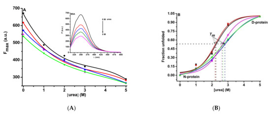(A) BSA (3 µM) denaturation by urea in the presence of the ferrihydrite nanoparticles (3 µM). (B) Unfolding curves corresponding to: BSA (●), BSA-S1 (●), BSA-S2 (▀), BSA-S3 (▲), and BSA-S4 (▼) samples.