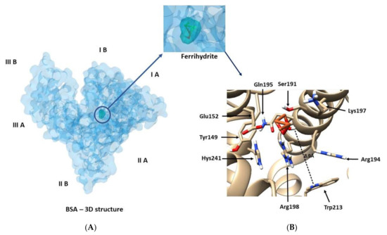 The ligand, ferrihydrite, is positioned in the BSA binding site, surrounded by Tyr 149, Arg 198, Trp 213, Arg 256, Gln 195, Glu 152, Lys 197, and Ser 191 (Figure 9B). The distance between Trp 213 and ferrihydrite is 0.89 nm, thus, the molecular docking results agree with these obtained in fluorescence and FRET. The binding of ferrihydrite occurs through hydrophobic cavities located in the sub-domain IIA of BSA (Figure 9A), according to other references [61].