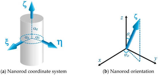 (a,b) respectively show the nanorod’s coordinate system (,,) and the angle between the axis () of the nanorod and the (,,) coordinate system (). represents the angle between the axis of the nanorod and the z-axis, and represents the angle between the projection of the axis of the nanorod on the xoy plane and the x-axis.