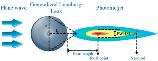 PJ generated by a plane wave illuminating a GLLs. In the figure, plane waves, GLLs, photonic jets, and nanorods and some of their parameters (such as the maximum radius R and the focal length fGLLs of GLLs, the focal point of the photonic jet, the focal length f and FWHM) are marked respectively. GLLs are composed of 30 layers of concentric rings with different refractive indexes centered on the center of the sphere.