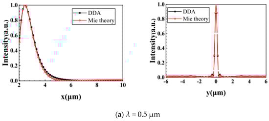 In this section, we calculate the photonic jet generated by a plane wave irradiating a GLLs respectively through DDA and Mie theory and compare the results. The schematic diagram of the PJ irradiating nanorod is shown in Figure 3. DDSCAT and Jan Schäfer [46,47,48,49,50]’s Mie theory software were used, and the two results were normalized by [51], where, , and are the intensity at any position, the maximum value, and the minimum value, respectively. The error of all comparisons is within one-thousandth. As shown in Figure 4, the wavelengths are 0.5 (Figure 4a) and 0.6328 μm (Figure 4b) respectively, the maximum radius of GLLs is 2 μm (i.e., Mie size parameter q 20), and the focal length is 1.2 a.u..