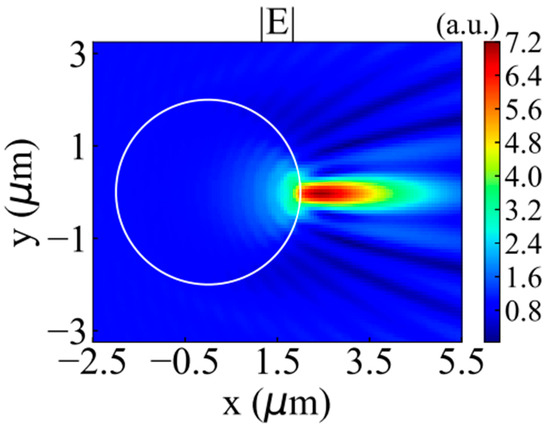 In this section, we will analyze the influence of nanorod’s orientation on the optical force. As mentioned earlier, the focal length and the maximum radius of GLLs are 1.2 and 2 μm. The incident wavelength is 0.6328 μm, the dielectric constant of the gold nanorod is −11.740 + 1.2611i, and the volume is 4.2 × 10−3 μm3. We will first show the electric field of the photonic jet under this set of parameters, as shown in Figure 5. The intensity of the focal point of the photonic jet is 51.7 a.u., the focal length f is 0.62 λ, and the is 0.5 λ. Next, we will use two subsections to discuss the influence of the orientation and of the nanorods on the optical force.